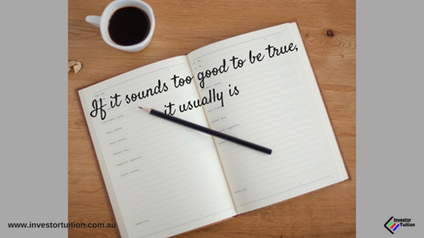 Investments are bought, not sold to you, is actually one of my own quotes. Many people get their first taste of investing by attending a seminar, staffed by slick salespeople who are usually selling in- vestment properties. These seminars are purposefully extravagant to portray money and success, the obvious fruits of any investment. Unfortunately most (I wanted to say all, but maybe there is an exception out there!) just give ‘pie in the sky’ promises and many people have regretted the day they wandered into the auditorium.